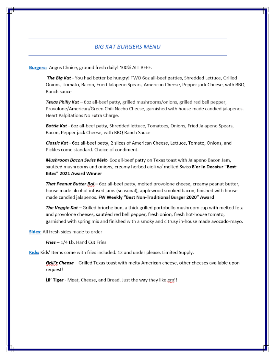 For the little ones, the menu features delightful options like the Grill't Cheese and the Lil' Tigah, ensuring everyone finds something to love. Top it off with homemade Chocolate Chip Cookies for a sweet finish. With a relaxed atmosphere and friendly service, Big Kat Burgers promises a satisfying meal that will have you coming back for more.